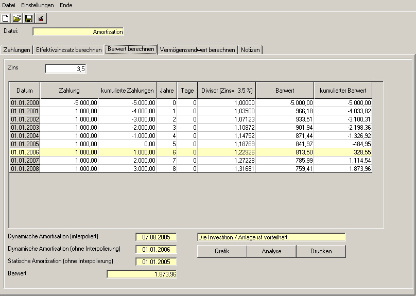 Mit dem Effektivzinsrechner können Sie alle Kredite, Geldanlagen, Investitionen, Leasing, Lebensversicherungen etc. auf Ihre Vorteilhaftigkeit überprüfen und die Angaben von Banken, Versicherungsmaklern kontrollieren.